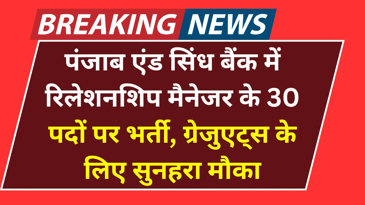 Punjab and Sindh Bank Recruitment 2025: अगर आप बैंकिंग सेक्टर में नौकरी की तलाश कर रहे हैं, तो आपके लिए खुशखबरी है । पंजाब एंड सिंध बैंक ने रिलेशनशिप मैनेजर ( Relationship Manager ) के पदों पर भर्ती का नोटिफिकेशन जारी किया है। इस भर्ती के तहत कुल 30 पदों पर नियुक्तियां की जाएंगी । इच्छुक और योग्य उम्मीदवार बैंक की आधिकारिक वेबसाइट पर जाकर ऑनलाइन आवेदन कर सकते हैं । आवेदन प्रक्रिया शुरू हो चुकी है और उम्मीदवार तय समयसीमा के भीतर आवेदन पूरा कर सकते हैं ।